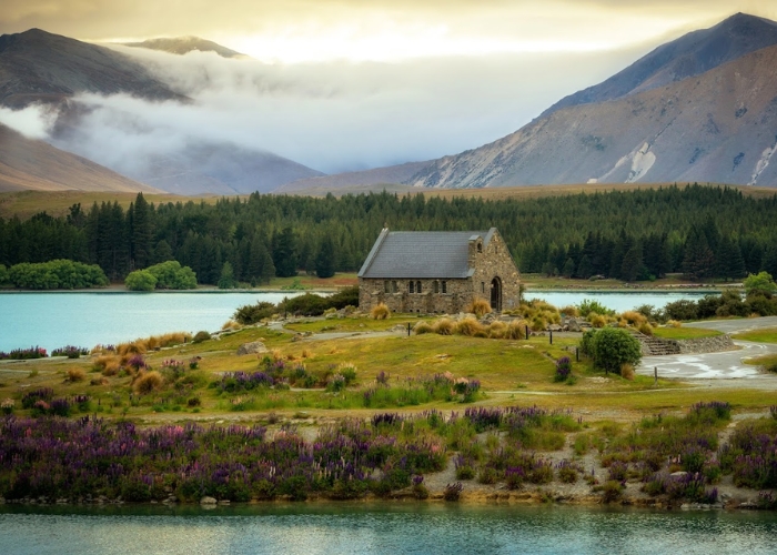 Biểu tượng của hồ là Church of the Good Shepherd, nhà thờ đá nhỏ nằm sát mép nước, xuất hiện trong vô số bức ảnh postcard của New Zealand. Vào mùa xuân và đầu hè, hoa lupin nở rộ quanh bờ hồ, phủ tím, hồng và xanh cả không gian, khiến Tekapo trông như một bức tranh sơn dầu ngoài trời.